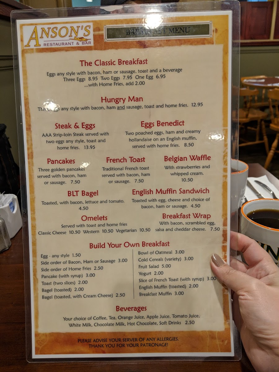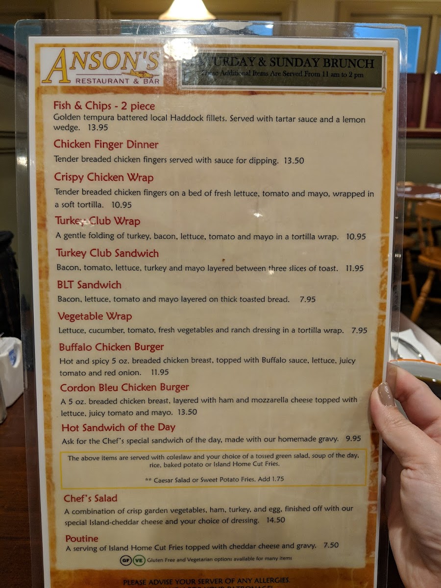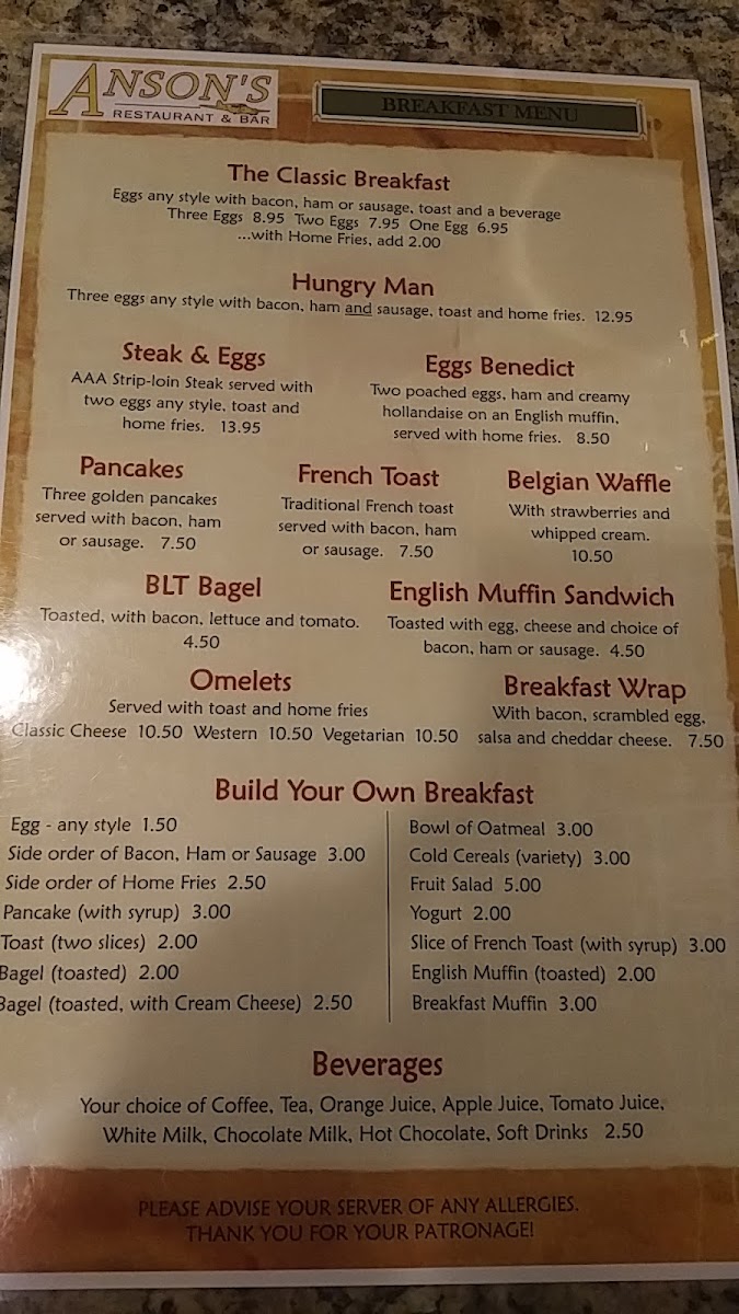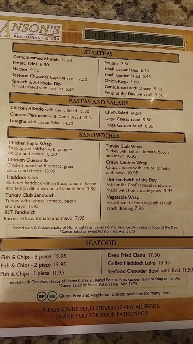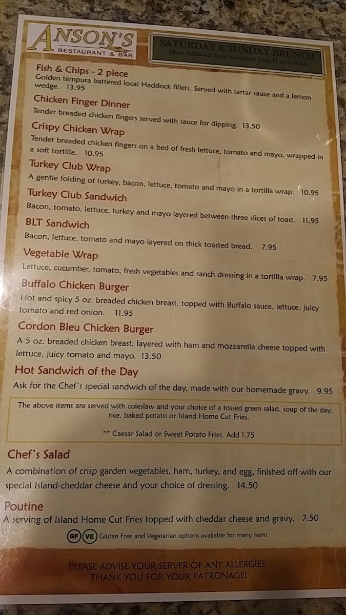 Welcome to Anson's Restaurant & Pub, the hidden gem of Slemon Park, PE, where culinary delight meets warm hospitality. Nestled at 12 Redwood Ave, Anson's offers a diverse menu that caters to every palate, making it a perfect spot for any occasion. With breakfast specialties like Pancakes, Eggs Benedict, and the hearty Hungry Man, mornings here start deliciously. Complement your meal with refreshing beverages, including Apple Juice and Hot Chocolate.